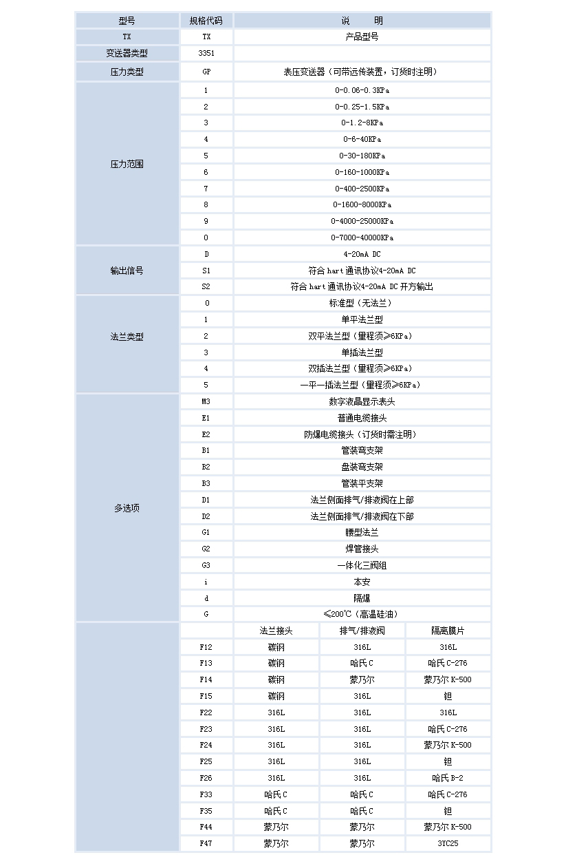 选型示例:TX3351-GP4S10M3E1B2F22;表示量程范围为0-40KPa,带HART通讯协议,带液晶显示的标准型压力变送器